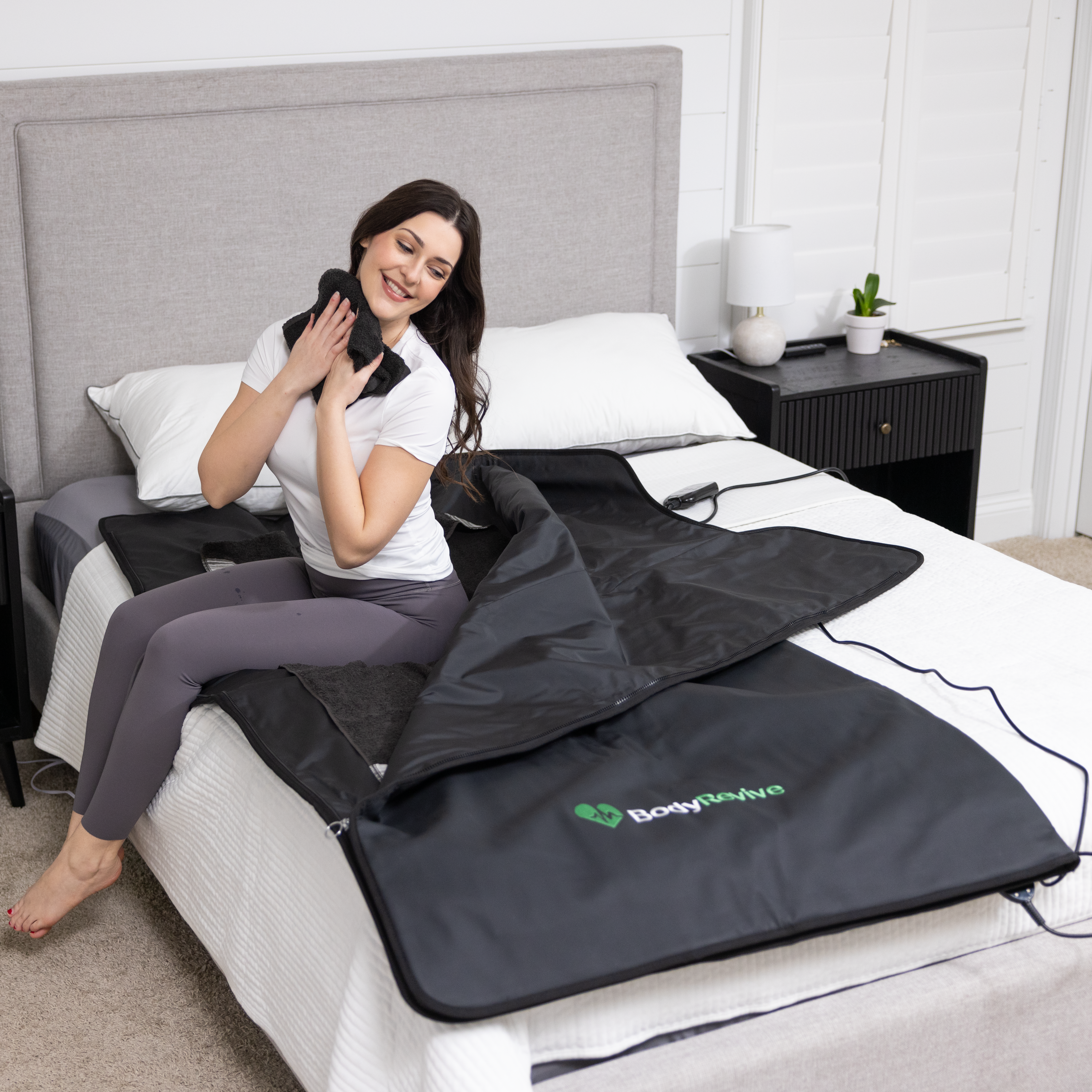 De BodyRevive® HeatPro Saunadeken helpt je om tot 600 calorieën per sessie te verbranden, terwijl je geniet van diepe ontspanning.Transformeer je afslankroutine met de kracht van infraroodwarmte!